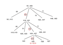 n-ary search mechanism with 64 hashes (m = 64, n = 4, l = 3).