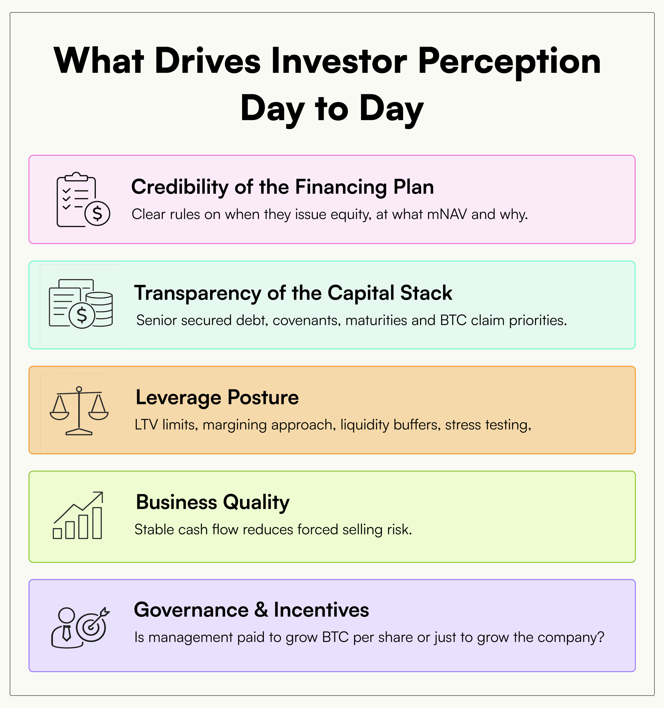- Funding discipline: equity issuance only makes sense if it increases BTC per share
