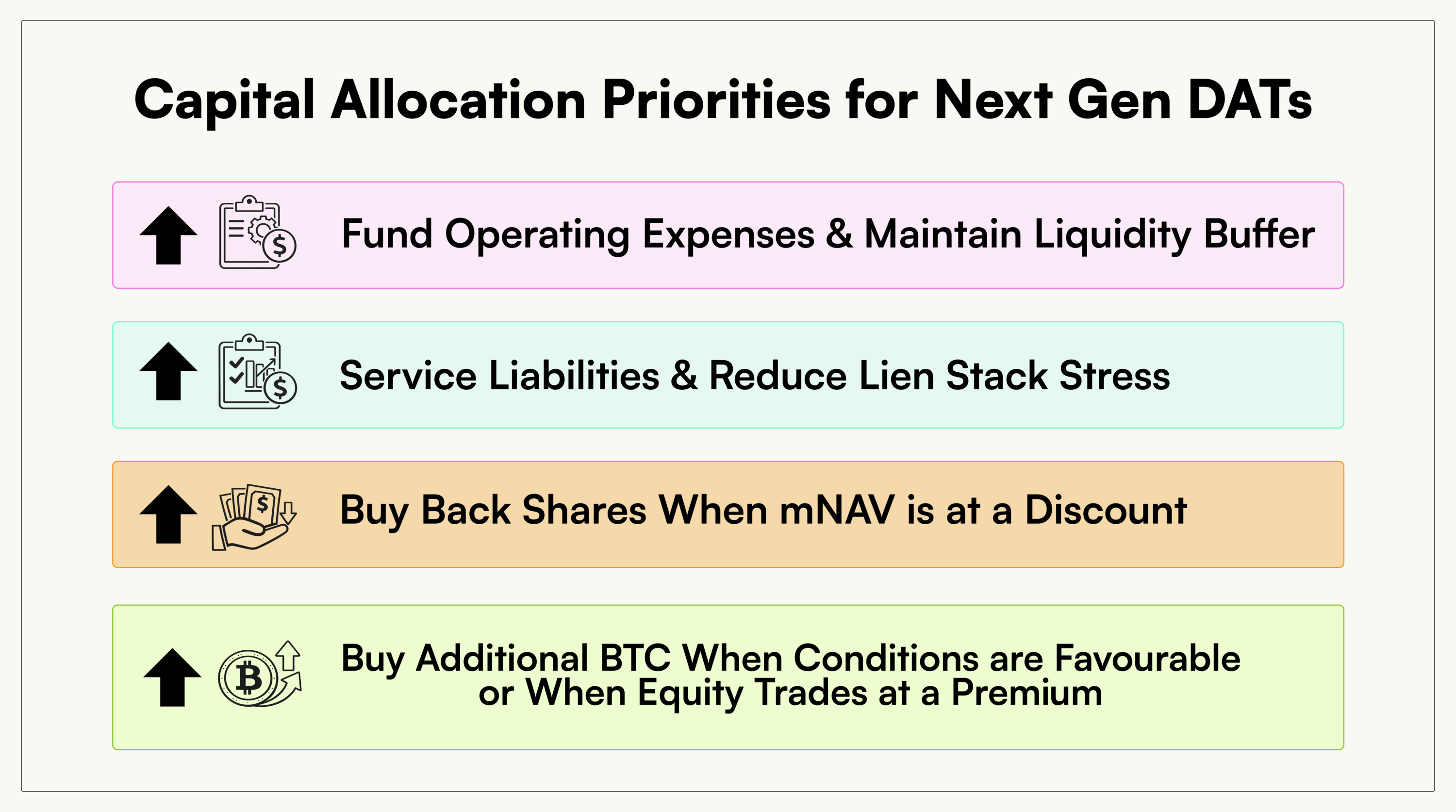 - Funding discipline: equity issuance only makes sense if it increases BTC per share