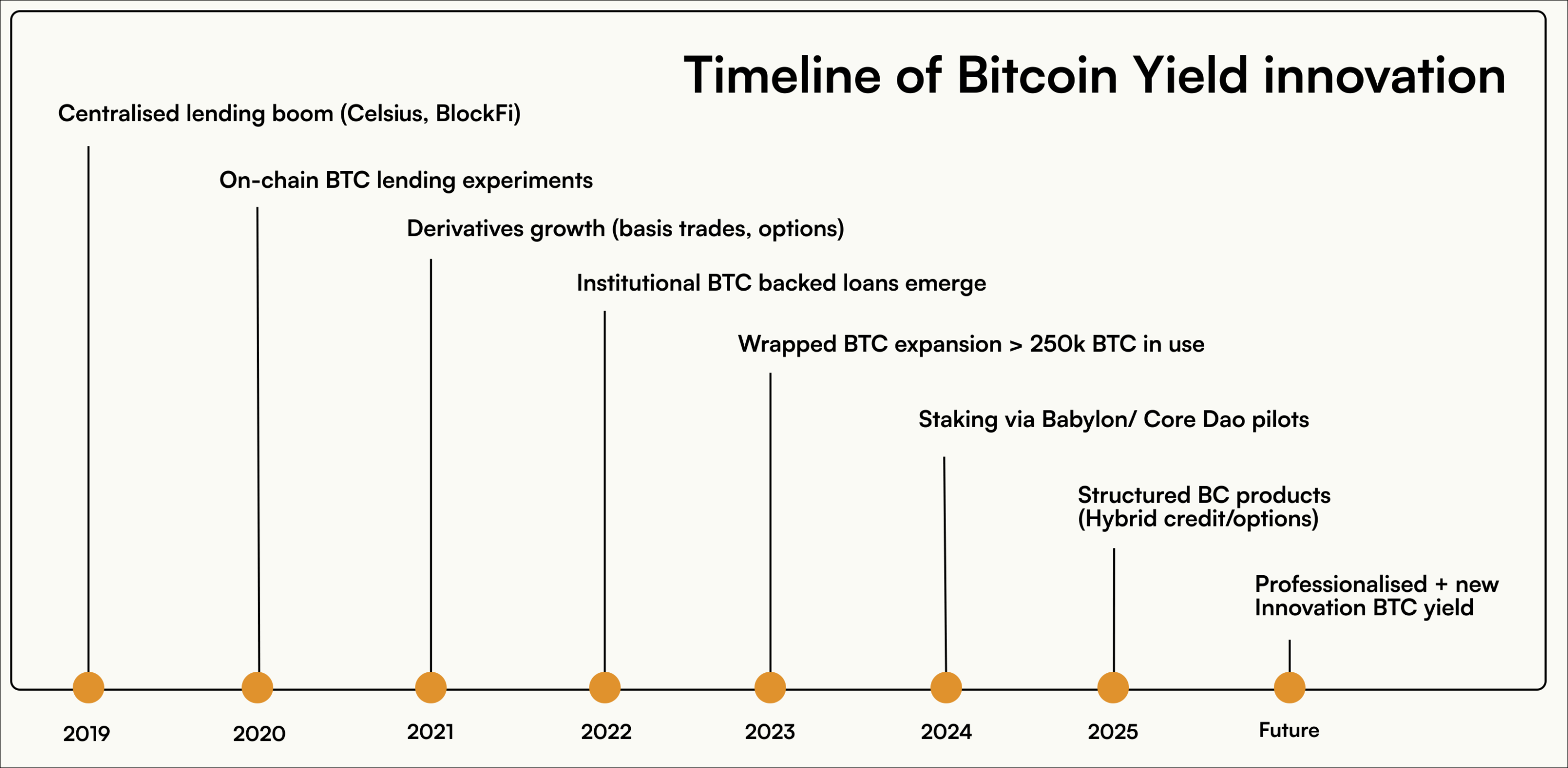Timeline of Bitcoin yield innovation from early lending to structured BTC products.