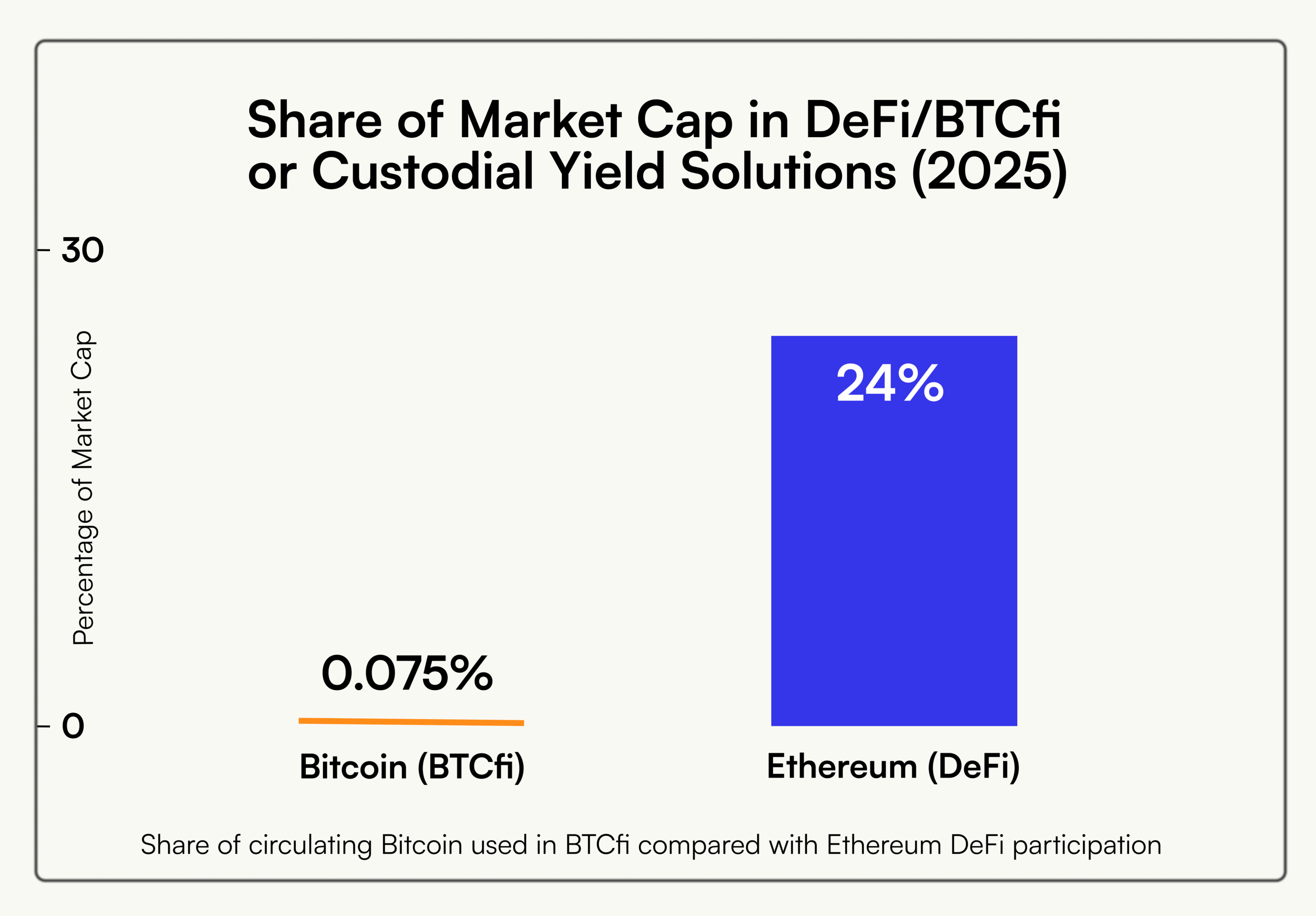 Share of circulating Bitcoin used in BTCfi compared with Ethereum DeFi participation.