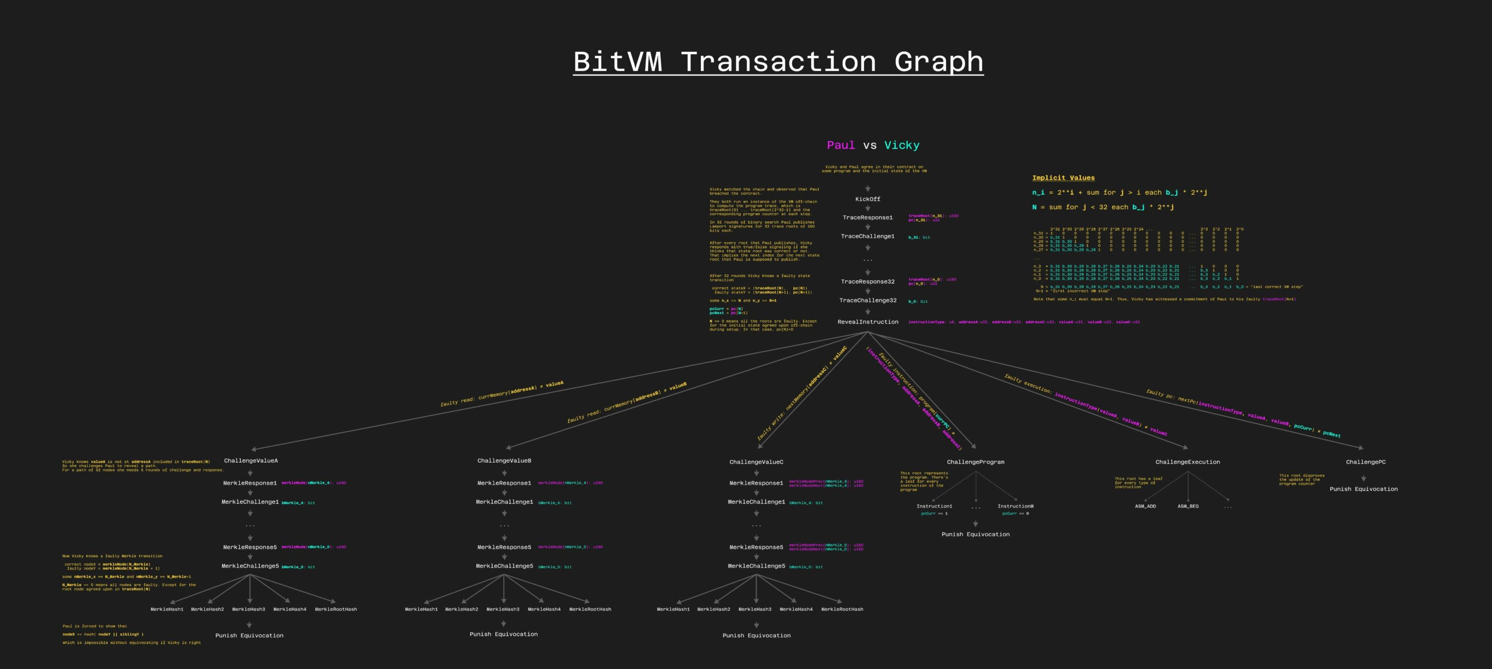 The verification game in BitVM starts with a binary search over the trace Merkle tree where the verifier identifies an invalid state transition. The prover submits the details of the conflicting computational step, including its inputs, opcode, and output. The verifier can then challenge different parts of the state transition, including the instruction type, the program counter, or the input or output values. Performing this binary search means that the verification game requires log2(n) rounds for n computational steps.