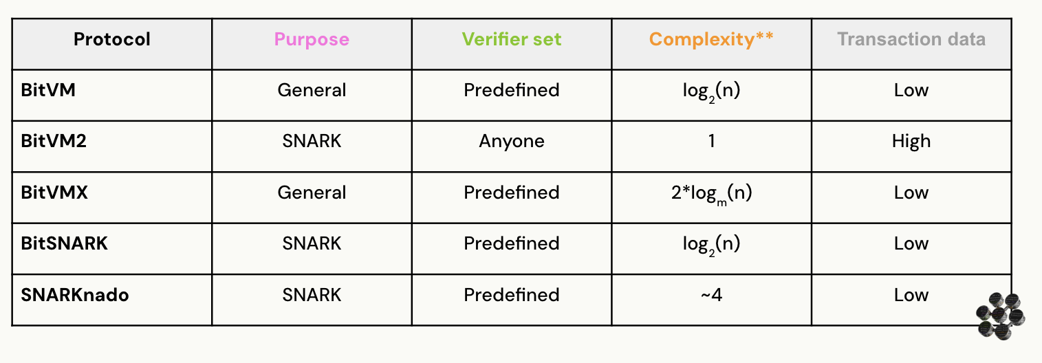 BitVM2 is the only protocol that requires just one round and that allows anyone to become the verifier, while the rest of the proposals define the set of verifiers during setup. BitVM2 achieves this at the cost of publishing more data in a single transaction. The other two SNARK-based protocols provide different trade-offs, with SNARKnado presumably achieving a better balance between the number of rounds and the amount of data submitted on-chain. Nevertheless, all solutions except for BitVM are still in development and their actual performance might depend on implementation details, as well as on specific use cases. In addition to this, we are likely to see protocol improvements and new proposals emerging in the coming months.