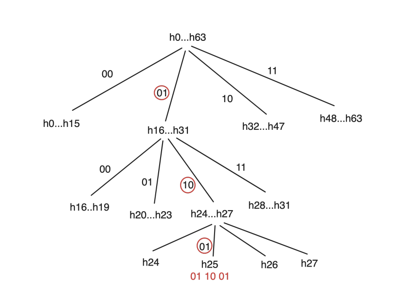 n-ary search mechanism with 64 hashes (m = 64, n = 4, l = 3).